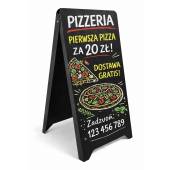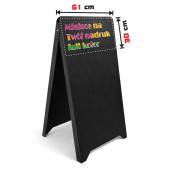 Potykacz umożliwia także wykonanie nadruku full-kolor (maks. 55×30 cm), co sprawia, że Twoja reklama może być spersonalizowana, czytelna i wyjątkowo atrakcyjna wizualnie. Produkt idealnie nadaje się do prezentacji menu, promocji sezonowych, ofert dnia, informacji o wydarzeniach czy nowych usługach.